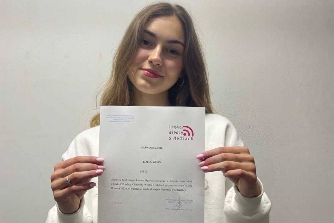 Zofia Woss została finalistką Olimpiady Wiedzy o Mediach zorganizowanej przez Wydział Dziennikarstwa Informacji i Bibliologii Uniwersytetu Warszawskiego. Udział w olimpiadzie pozwolił na poszerzenie wiedzy z zakresu nauki o mediach w społeczeństwie, edukacji medialnej, świadomego odbioru i współuczestnictwa w komunikacji społecznej.