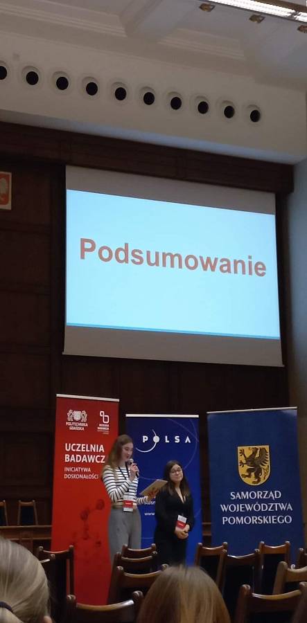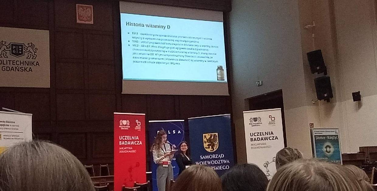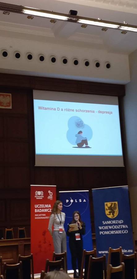 W minioną sobotę 26 listopada w ramach projektu Zdolni z Pomorza odbyła się VI Pomorska Uczniowska Konferencja Naukowa. Tematem tegorocznego spotkania było "Słońce, Księżyc. Spójrzmy w niebo okiem naukowca lub artysty". W sesji biologicznej jako jedne z 6 wystąpiły z prezentacją "Tworzenie się witaminy D w organizmach i jej rola w utrzymaniu zdrowia" uczennice naszej szkoły Zosia Woss i Ola Pielas. W przygotowaniu prezentacji uczestniczył również Beniamin Marcisz.