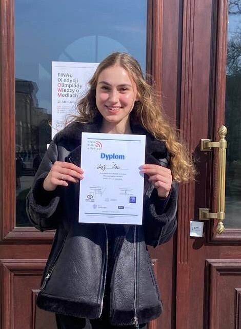 Zofia Woss uczennica klasy 4B Społecznego Liceum Ogólnokształcącego w Lęborku 17 – 18 marca 2023 r. uczestniczyła w centralnym etapie IX edycji Olimpiady Wiedzy o Mediach zorganizowanej przez Wydział Dziennikarstwa, Informacji i Bibliologii Uniwersytetu Warszawskiego pod patronatem Ministra Edukacji i Nauki.