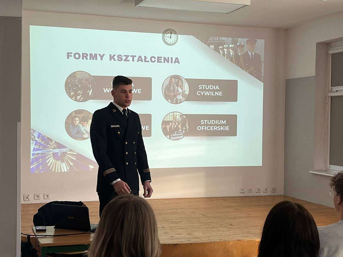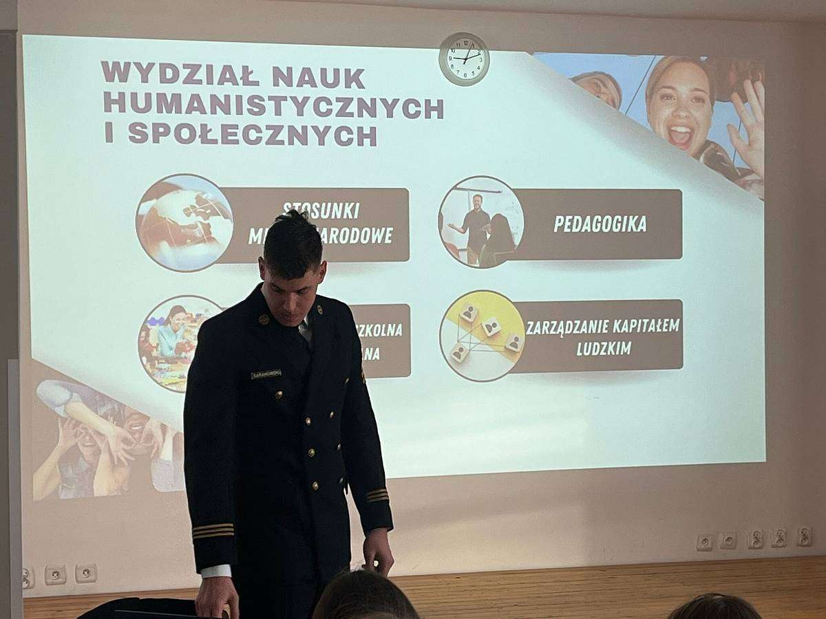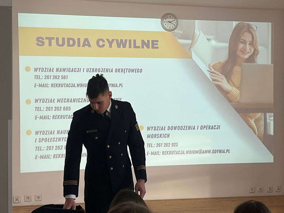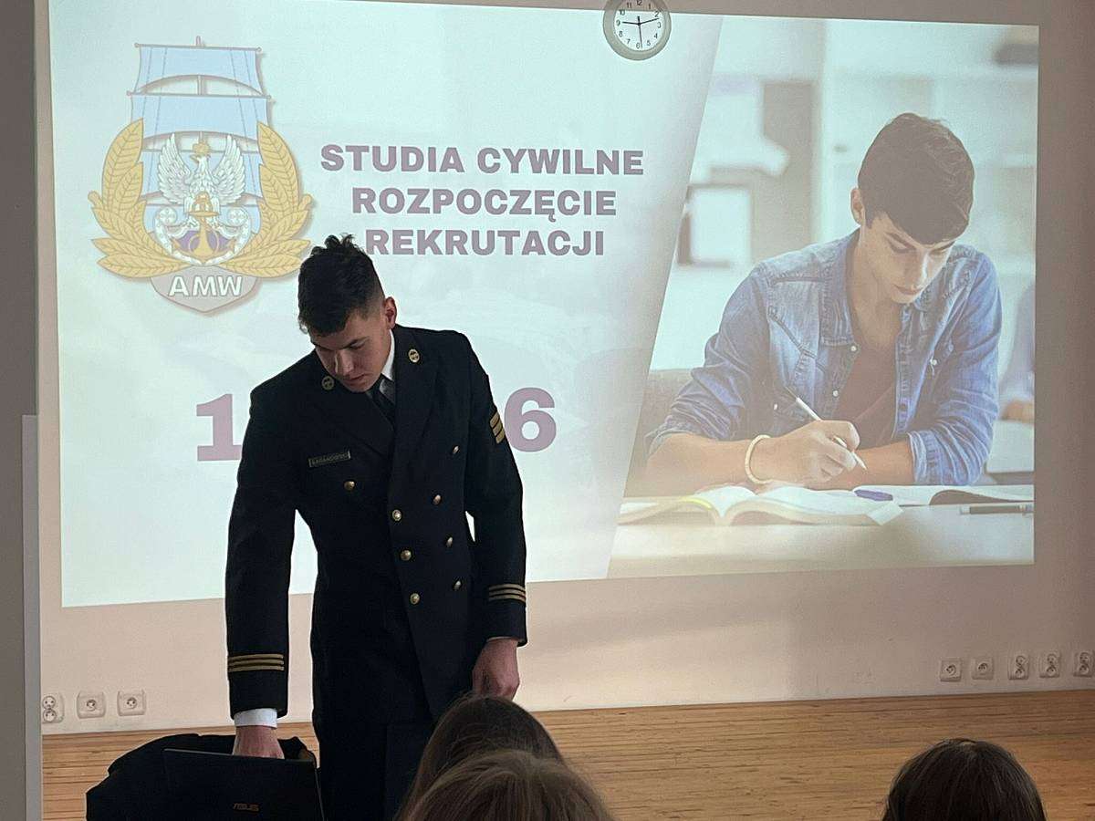 W poniedziałek 16.02 gościliśmy w szkole naszego absolwenta MACIEJA BARANOWSKIEGO . Maciej jest obecnie studentem III roku Akademii Marynarki Wojennej w Gdyni i przedstawił swoim młodszym kolegom z klasy 4 i 3 jak wyglądają studia na jego uczelni, jak należy przygotować się do rozmowy kwalifikacyjnej i jakie kompetencje powinien posiadać przyszły student tej uczelni.